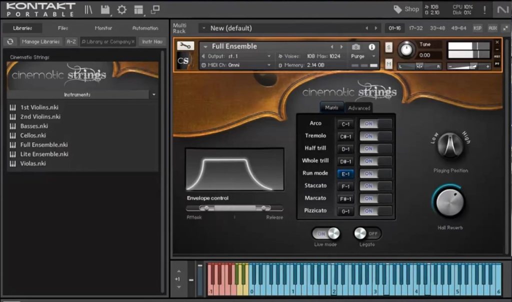 Cinematic Strings 2包含了多个版本,如2.0版本,其中提供了5个补丁(patches),分别是1st Violins、2nd Violins、Violas、Cellos和Basses。每个补丁都可以让用户全面访问该部分内的所有麦克风和演奏法。