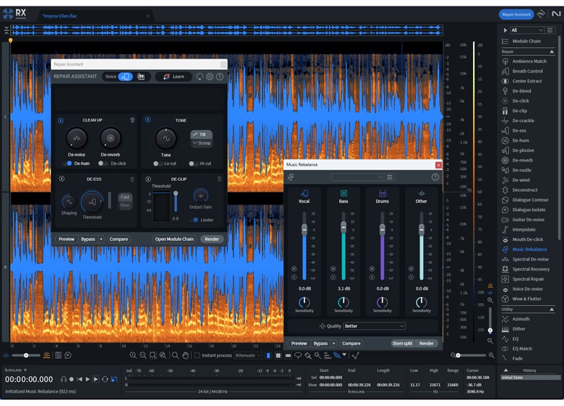 Visually target and replace unwanted sounds like dog barks, string squeaks, and sirens with RX’s Spectrogram. Tackle specific issues like clicks, clips, hum, rustles, and background noise with bespoke repair modules. Get even more surgical with tools that can re-shape the intonation of dialogue, remove reverb, match ambiences and EQ profiles, and much more. Plus, if you’re looking for a helping hand to get great results fast, RX’s Repair Assistant intelligently recognizes and proposes fixes for specific problems that you can tweak to your liking with easy-to-use dials.