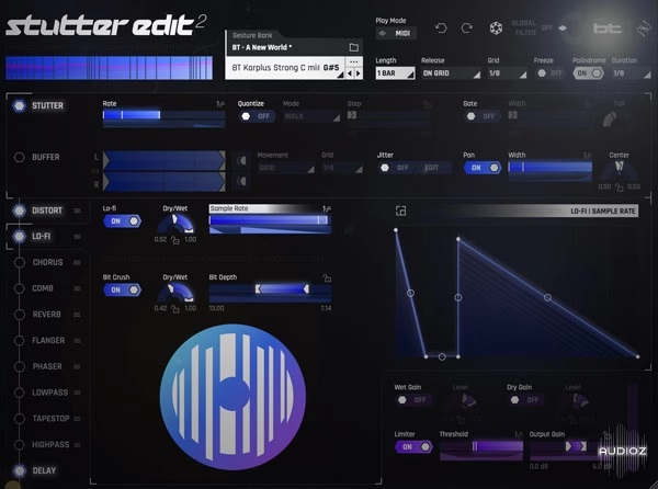 除了口吃效果之外,表演者和制作人还可以在现场表演和录音室安排中,在多种有节奏的手势之间进行切换,以建立紧张感并创造动态。这个新版本提供了更轻松的设置体验和大大扩展的效果套件,可以访问近乎无限的声音组合。使用新的 AUTO 模式,用户可以将声音添加到混音中而无需路由,或者轻松连接 MIDI 控制器以一次访问多个手势。新版本还包括升级的 Distort 模块和新的 Comb、Chorus 和 Limiter 模块,来自 BT 个人收藏的新混响模块,以及一套 11 种效果器。Stutter Edit 2 中的每个参数都可以设置为随手势及时移动,让用户可以创建从自动平移到跳跃混响效果等的所有内容。