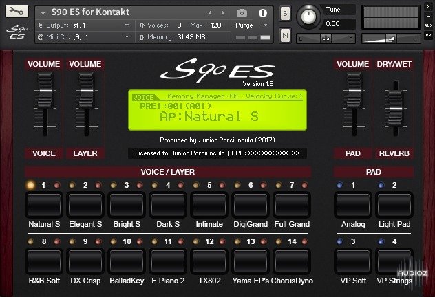 14 timbres do Yamaha S90 ES cuidadosamente sampleadas usando a saída mLan16 (FireWire Digital). Display mostrando o preset do Voice e Dual Voice, com controle de volume independente. Você pode alternar entre os timbres sem cortar o áudio. Se você salvar o instrumento, manterá as últimas configurações que você realizou.