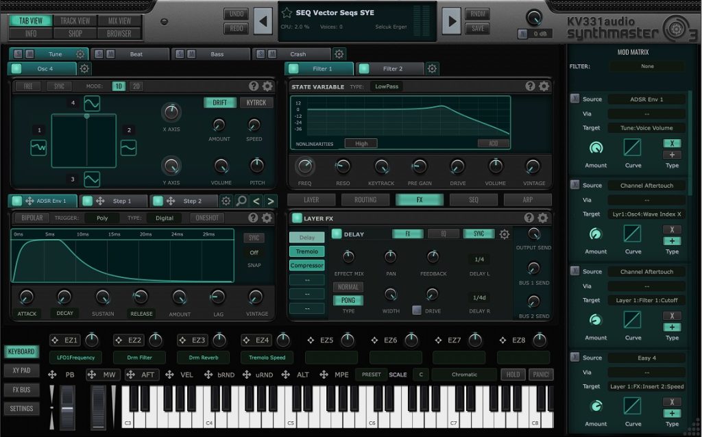 SynthMaster 3 is KV331 Audio’s flagship all-around modular software synthesizer available in VST2, VST3, AudioUnits and AAX formats. It features many different synthesis methods including VAnalog, Additive, Vector, Wavetable, Granular, Phase Modulation, Phase Distortion, Frequency Modulation, Pulse Width Modulation, Ring Modulation, Physical Modeling and SFZ Sample Playback. It comes with 3150 factory presets designed by a world class team of sound designers: Arksun, Aiyn Zahev, BigTone, Cipryan Bot, Davide Puxeddu, Demis Hellen, Gercek Dorman, NatLife, New Loops, Nori Ubukata, Selcuk Ergen, Xenos Soundworks, XTD and Yuli Yolo