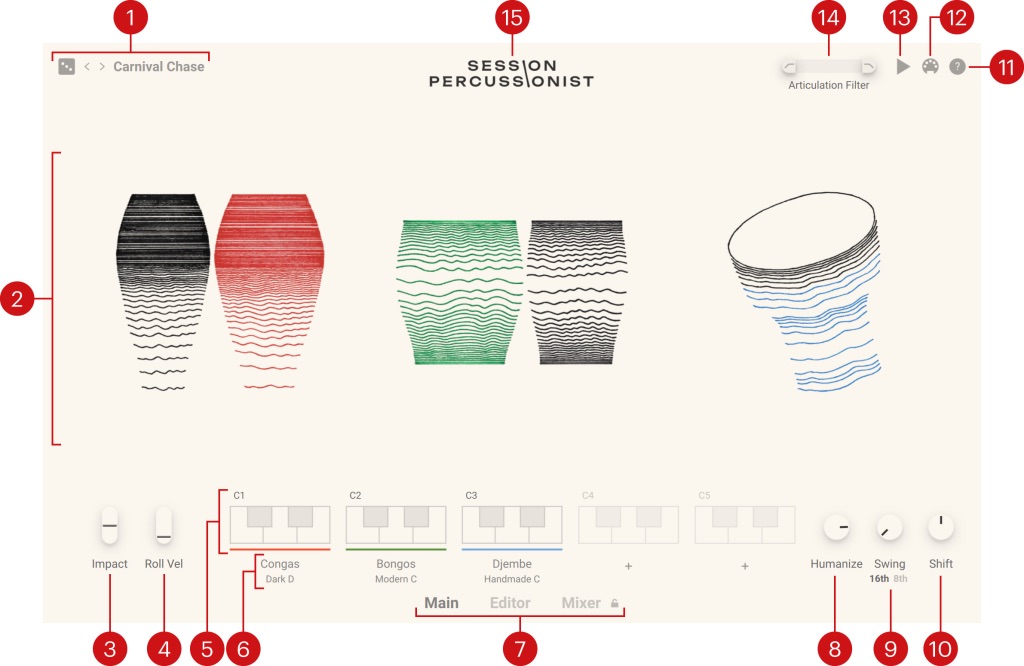 首次打开Session Percussionist时,您会看到主页面以及一组全局控件: