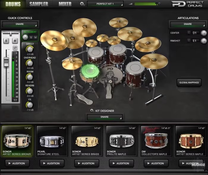 Perfect Drums配有广泛的声音库,包括来自当前最好的鼓制造商的131个精心采样的鼓乐器。其中包括:13个打鼓,12个小鼓,29个(8个全套),9个踩镲,11个骑行,31个不同位置的倒镲,13个瓷钹(左侧5个,右侧8个) ,8个飞溅镲片,2个自定义叠镲,2个铃铛和1个jamblock乐器,全部形成12个完美套件预设。完整的仪器列表可以在MEDIA部分找到。