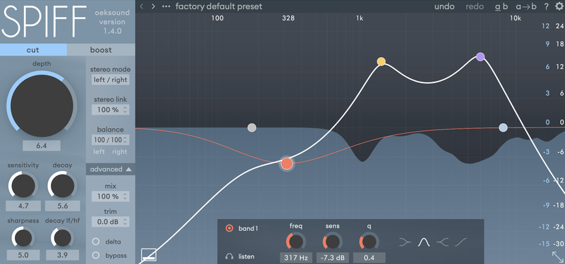Where traditional transient shapers work as compressors and envelope shapers over one or more bands, Spiff approaches transients differently. It analyzes the incoming signal using spectral analysis and applies cuts or boosts using dynamic filters. Spiff does not use any crossovers in the process, which eliminates any possibility of crossover artifacts that can occur in multiband transient processors.
