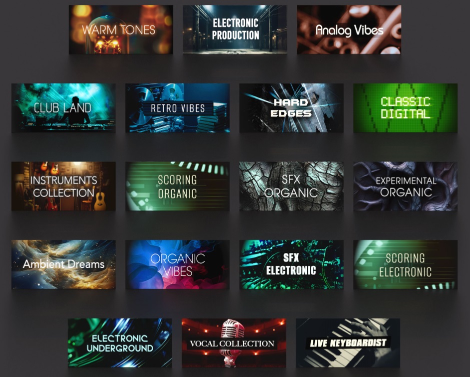 全新音色库中,您可以快速找到所需的音色,这些音色库按用途类型进行了细致的分类。