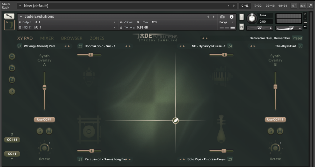 Based on our experience with our Syllabuilder and X3M engines, we developed a brand new one using Native Instruments’ Kontakt sampler to give you acess to these performances in an intuitive way, but also to combine them with custom electronic sounds recorded from Hardware Synthesizers for that modern cinematic sound. The core of Jade Evolutions is the XY Pad, which allows you to freely morph and blend between 4 zones of mapped instrumental performances and freely layer in Electronic soundsources.