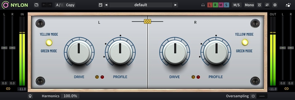Nylon:灵感来自独特而迷人的电路,Nylon 提供两种着色模式:黄色表示闪烁的高音,绿色表示强劲的低音。两者都是“透明过载”效果,可添加微妙的谐波内容,比典型的饱和器更温和。黄色模式主要在高频产生谐波,产生明亮、抛光的“光泽”。绿色模式主要在低频增加饱和度,使低音、底鼓或鼓总线更加庞大和激进。
