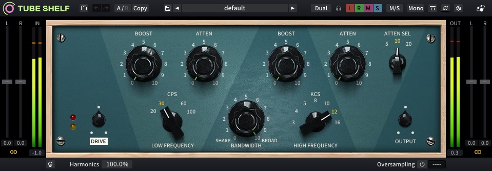 Tube Shelf:灵感来自有史以来最具标志性和音乐性的程序均衡器之一,Tube Shelf 忠实地模拟了原始电子管电子设备的均衡器特性和独特音调。 Tube Shelf 模块主要用于调整低频和高频。由于频带选项相对较少,它通常与其他 EQ 配对,以进行更详细的音调塑造,最常见的是与 Tube Bell 和 Tube Filter 模块配对。