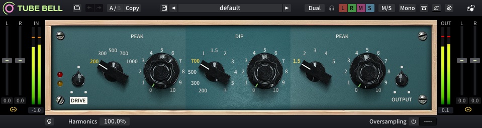 Tube Bell: As a complement to Tube Shelf, Tube Bell is primarily responsible for mid-frequency processing. It features two Peak sections and a Dip section, all utilizing Bell-type filters.