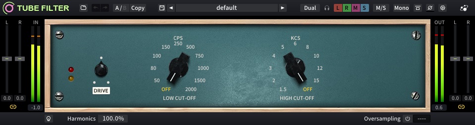 Tube Filter:Tube Filter 通过高切和低切增强了 Tube Shelf 和 Tube Bell。虽然高切在混音中不太常见,但 Tube Filter 平滑、自然的高切在必要时擅长“变暗”声音。